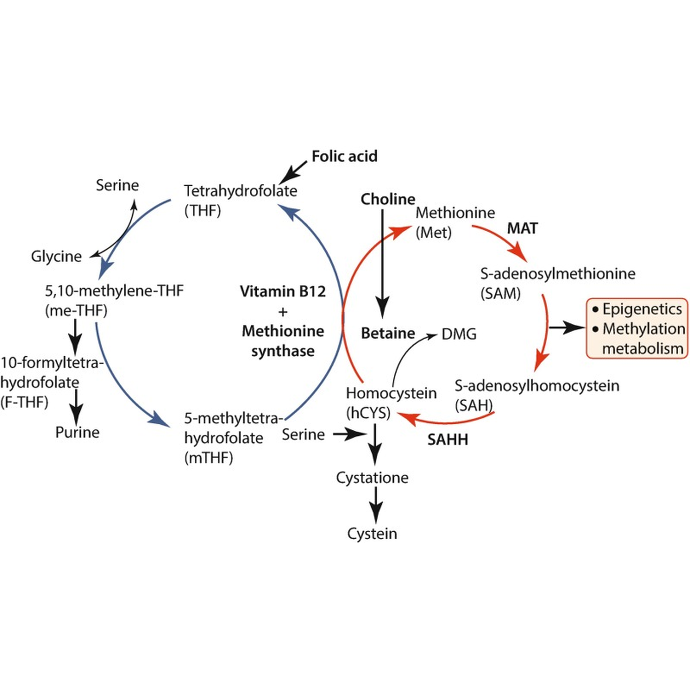 • Folate (B9) + B12: Drive one-carbon metabolism, generating S-adenosyl-methionine (SAM) for methylation reactions that modulate gene expression and monoamine pathways; they also lower homocysteine, a risk factor for cognitive decline. B12 additionally supports myelin synthesis and neuronal integrity.